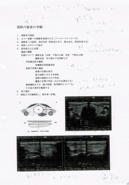 甲状腺超音波ガイドブックは2010年に改訂され、甲状腺全体の観察項目として、(1)甲状腺の形状、(2)大きさ(3)甲状腺内部の変化、(4)血流の状態の4項目をを挙げているほか、結節性甲状腺腫の観察項目として(1)形状、(2)境界、(3)内部エコー、(4)境界部低エコー、(5)周辺機器との関係、(7)腫瘤内・外の血流状態(8)組織弾力イメージングを実施するとしている。県民健康調査の甲状腺検査は、このうち3分の1にあたる、4項目を除外していたことになる。また、作成された「実際の作業の手順」も非常に簡素なものとなっている。