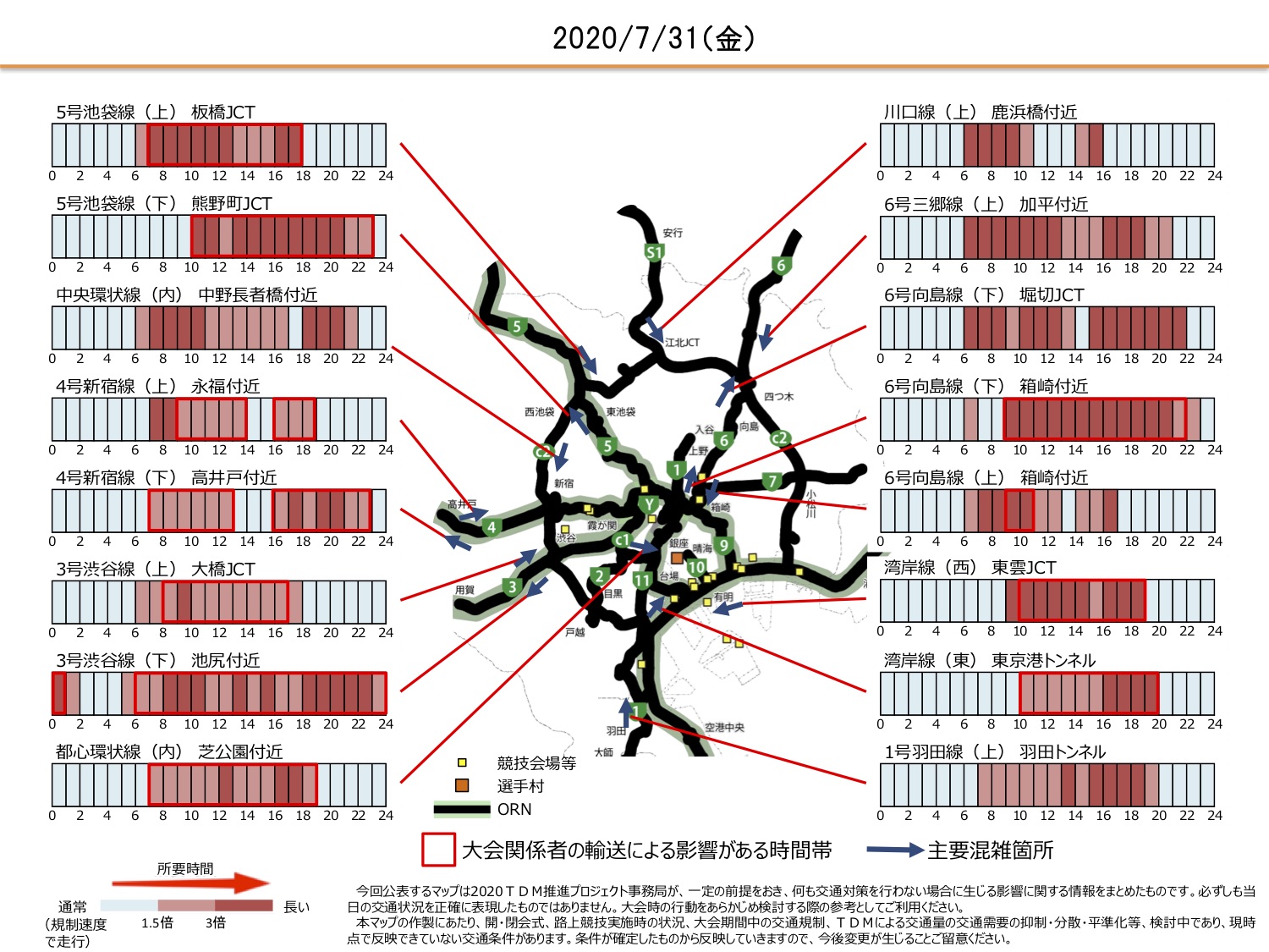 公表されたのは「大会輸送影響度マップ」。組織委員会と都による「交通輸送技術検討会」の検討を受けて公表されたもので、鉄道はもっとも多くの競技が行われる7月31日の朝5時から深夜にかけての予想。また道路に関しては、開会式翌日となる7月25日から8月3日までの全日程をシミュレーションした。