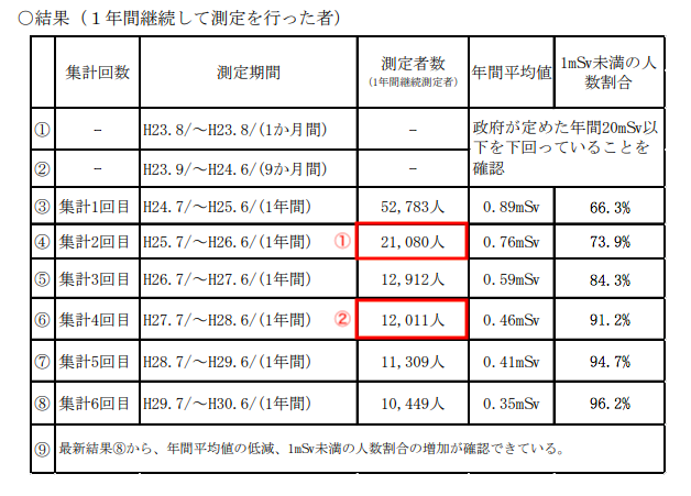 なお伊達市が「伊達市被ばくデータ提供に関する調査委員会」に提供した資料によると、同時期の対象者は1,4372だが、今回の撤回コメントでは、12,011と記載。2015年7月から16年6月の間、継続して個人線量を計測した住民の人数)下記表の②)が誤って記載されている。